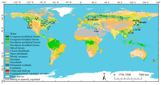 - Sulla-Menashe, D.; Gray, J.M.; Abercrombie, S.P.; Friedl, M.A. Hierarchical mapping of annual global land cover 2001 to present: The MODIS Collection 6 Land Cover product. Remote Sens. Environ. 2019, 222, 183–194. [Google Scholar] [CrossRef]