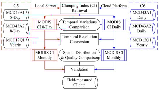 - Wei, S.S.; Fang, H.L.; Schaaf, C.B.; He, L.M.; Chen, J.M. Global 500 m clumping index product derived from MODIS BRDF data (2001–2017). Remote Sens. Environ. 2019, 232, 15. [Google Scholar] [CrossRef]