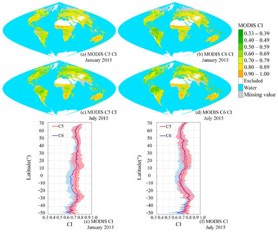 - The C5 and C6 CI data show similar spatial distributions globally. These two versions of data exhibit similar spatial patterns and latitudinal distributions globally in January and July, which relate to the distribution of vegetation types and leaf-on/leaf-off seasons. Forest areas have lower CI values, while grass, shrub, crop, and savanna regions display higher CI values. In the Northern Hemisphere, the January CI is generally higher than that in July, and the opposite is true in the Southern Hemisphere.