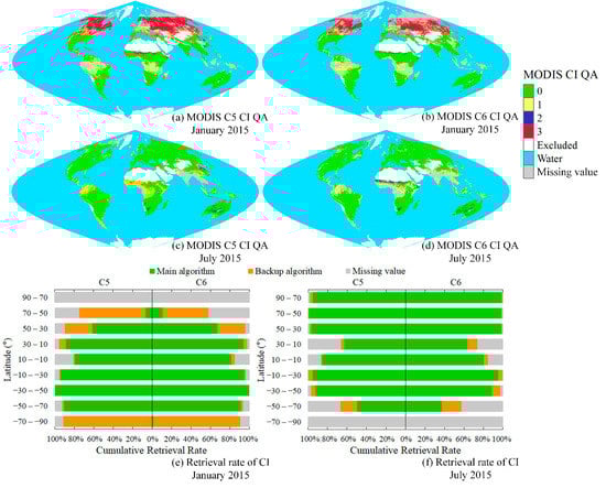 - The C5 and C6 CI QA data show similar patterns globally, while the C6 CI data have an improved quality with more main algorithm retrievals and fewer missing values. For both versions of data, the overall proportion of main algorithm retrievals is higher in July than in January, while the C6 data show a higher rate of main algorithm retrievals and a lower rate of missing value in the summer hemisphere and a lower rate of backup algorithm retrieval in most of the world.