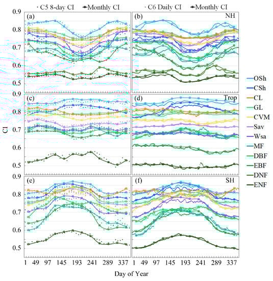 - In general, the C5 and C6 CI data show similar seasonal variations in the three latitude zones (NH, SH, and Trop) and different land cover types, which is consistent with the vegetation phenology. Through quality screening and averaging, the monthly CI data have higher data quality and are recommended to characterize the overall seasonal patterns of the surface CIs well, with less uncertainty than using C5 8-day, monthly, and C6 daily CI data.