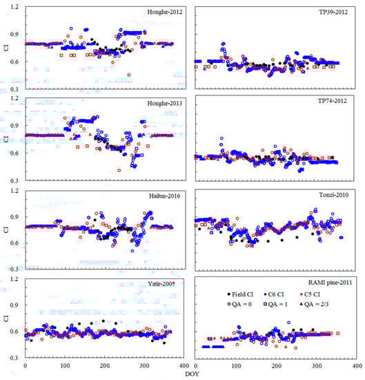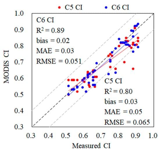 - Through a comparison with field-measured CI data, both versions of the MODIS CI data agree with the field-measured CIs and their seasonal variations, while the C6 CI data (R2 = 0.89, RMSE = 0.05, bias = 0.02) show better consistency with the field measurements than the C5 CI data (R2 = 0.80, RMSE = 0.07, bias = 0.03).