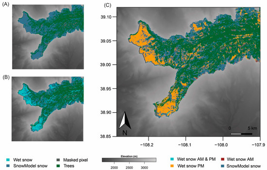 To generate a diurnal S1 snow conditions map, we first selected only snow-covered pixels (determined from SnowModel outputs) above 2900 m to limit the study to the Mesa top. Next, with binary wet snow maps generated for each orbit, coinciding descending (morning) and ascending (evening) passes were compared pixel-wise using the method generated in [38], with four possible output categories: (1) pixels that register as wet for both morning and evening passes, (2) pixels assigned not wet in the morning but wet in the evening; (3) pixels determined wet in the morning but not in the evening; and (4) pixels that do not register as wet in either pass (labeled SnowModel snow). An example of morning and evening wet snow identification, resulting in a diurnal S1 snow conditions map, is shown in Figure 3. All post-processing steps and analyses were accomplished in R [62].
