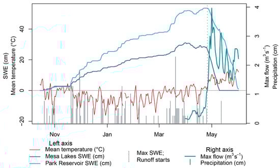 Mean daily temperature, precipitation, and accumulated SWE from Mesa Lakes Snotel site, accumulated SWE from the Park Reservoir Snotel site, and daily maximum streamflow measured from USGS Surface Creek gauge. Mean temperature (red) and SWE (blues) values are on the left axis scale; maximum daily streamflow (cyan) and incoming precipitation (grey bars) values are on the right axis scale.