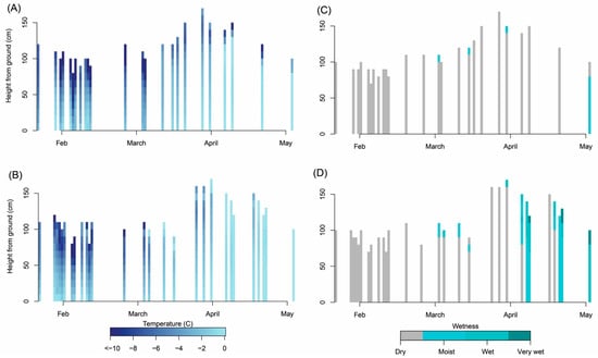 Figure 5 shows measurements of snowpack temperature (Figure 5A,B) and wetness (Figure 5C,D), with depth and over time. For comparison, morning and afternoon measurements are separated on the top and bottom rows, respectively.