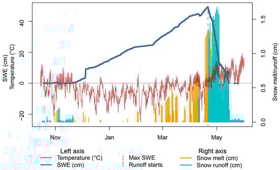 SnowModel calculated air temperature and SWE (left axis), melt, and runoff (right axis) at the Mesa West Pathfinder study site (Figure 1, yellow) on the northwestern lobe of Grand Mesa.