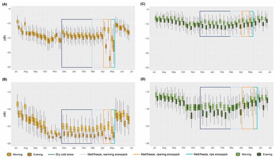Sentinel-1 (S1) backscatter values over time for (A) Grassland cover, co-polarized; (B) Grassland cover, cross-polarized; (C) Evergreen cover, co-polarized; and (D) Evergreen cover, cross-polarized. Morning and evening values are differentiated according to color shade. Colored box outlines indicate the field measurement-determined periods of cold, dry winter snowpacks (dark blue), surface melt/freeze cycles over a warming snowpack (light blue), surface melt/freeze cycles over a ripening snowpack (orange), and surface melt/freeze over a ripe snowpack (cyan). Co-polarized plots (top row) have a different y-axis scale than cross-polarized plots (bottom row).