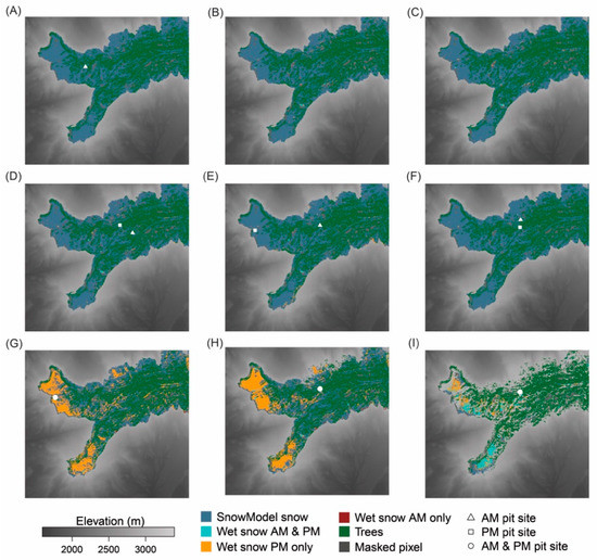 S1 diurnal wet snow comparison for (A) 28 January; (B) 9 February; (C) 21 February; (D) 4 March; (E) 16 March; (F) 28 March; (G) 9 April; (H) 21 April; and (I) 3 May 2020. S1 overpass dates with coincident field measurements show pit locations.