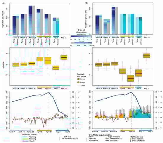Snow conditions integration panel for (A) morning and (B) afternoon for in situ measurements of snowpack temperature and wetness (top row), Sentinel-1 ratio values (middle row), and SnowModel output variables (bottom row) for 4 March–15 May 2020, covering periods of field-measured snowpack warming, ripening, and runoff (highlighted with light blue, orange, and cyan).
