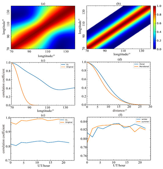 Figure 2a,b presents the distribution of the meridional correlation coefficients obtained from the statistical results and are localized by covariance. It can be seen from Figure 2a that the meridional correlation tends toward 0 with the increase in the distance. The local correlation coefficient is close to the original one in the central part, however, the attenuation is faster. The localization radius can control the size of the truncated region. The larger the localization radius is, the larger the correlation region will be, and the smoother the result after assimilation will be. However, the increase in the localization radius will lead to a sharp increase in the size of the covariance matrix. Therefore, it is important to choose a reasonable localization reification radius in practical applications. Figure 2c shows the correlation coefficient curves of the longitude before and after localization. Figure 2d shows the correlation coefficient curves of zonal and meridional. Figure 2e is the change curve of the correlation coefficient before and after localization at 5° from the reference point. Figure 2f shows the change curve of the correlation coefficient in different seasons at 5° from the reference point. The curve after localization is located below the before, but this does not exactly mean that the distribution fully depends on the localization radius. It can be seen from Figure 2c–f that the localized correlation coefficients are different for different directions, times and seasons. This also means that our covariance model contains ionospheric anisotropy information. When we estimate the correlation coefficient under different conditions, the sample size is much smaller than the variable dimension. The localization function can be regarded as a tapering covariance regularization method, which can provide some prior information for sample covariance [33]. This can not only reduce the error problem when estimating the covariance from small samples, but it can also avoid a series of abnormal problems caused by threshold truncation; for example, the covariance matrix is not positive-definite. However, whether the local function we use is optimal or whether we can estimate the optimal local function needs to be evaluated in the follow-up work.