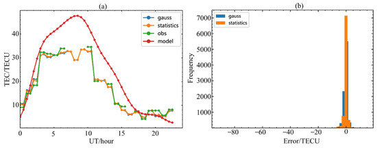 The comparison of TEC by different covariance modeling methods. (a) The comparison curve of TEC for different covariance modeling methods, observed and modeled in one day at 25°N, 90°E; (b) The TEC error statistical results of different modeling methods in one day.
