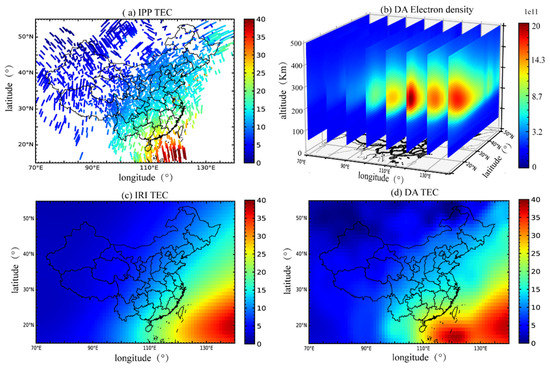 Electron density assimilation results at 00:00 UT on 1 January 2015. (a) VTEC of pierce point; (b) electron density distribution after assimilation (upper right); (c) VTEC calculated by IRI model (lower left); (d) VTEC after assimilation (lower right).