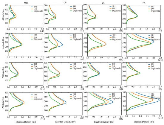Comparison of ionospheric electron density profiles. The green curve is the observational result of digisondes, the blue curve is the IRI modeling results, and the orange curve shows the assimilation results. The first and second rows are the electron-density profile contrast diagram at 00:00 UT and 06:00 UT on 1 January 2015, respectively. The third and fourth rows show the electron-density profile contrast diagram at 00:00 UT and 06:00 UT on 17 March 2015, respectively.