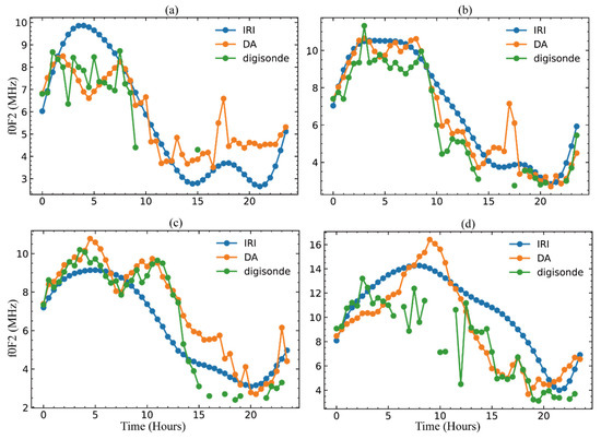 The foF2 is an important parameter in the ionosphere, and it is related to the peak electron density. In order to illustrate the influence of the assimilation model on peak electron density, Figure 8 shows the comparison of the foF2 variation at CP (a) and ZL (b) on 1 January 2015, and at MH (c) and FK (d) on 17 March 2015. Compared with the digisonde observations at these four stations, the RMSE (root mean square error) of the IRI model is 1.63 MHz, 1.28 MHz, 1.33 MHz, and 3.25 MHz, while the RMSE of the assimilation results is 0.84 MHz, 0.98 MHz, 1.12 MHz, 2.76 MHz, respectively, whose average RMSE is decreased by 0.44MHz. As presented in Figure 8, foF2, after assimilation, is closer to the digisonde observations. The changing trend of the IRI modeling results is consistent with the digisonde observations; however, it cannot accurately describe the changed details of the foF2. This result demonstrates that the assimilation model can effectively improve the accuracy of the electron density peak of the background model and can obtain more details.