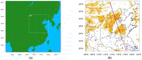 (a) double-nested experimental domain. (b) Spatial distribution of PM2.5 data (blue point) in d02, CALIPSO AEC data (orange point), and AOD data (red point).