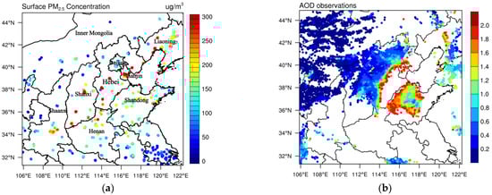 Three types of aerosol observational data, including PM2.5 mass concentration, H-8 AOD, and CALIPSO AEC, were used for assimilation and evaluation, and their spatial distributions are shown in Figure 1b. PM2.5 and AOD data were used for assimilation and all PM2.5, AOD, and AEC data were used for evaluation.