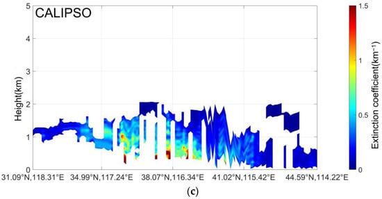 AEC profile data were obtained from Level 2 (version 4-2.0) AEC retrievals from CALIOP at 532 nm (https://www-calipso.larc.nasa.gov, last accessed: 5 May 2022). The horizontal resolution of the data was 5 km. Each profile had 399 layers, with a vertical resolution of 60 m at an altitude of −0.5~20.2 km and of 180 m at an altitude of 20.2~30.1 km. For the preprocessing and quality control of the CALIPSO data, please refer to Ye et al. [].