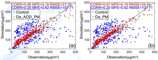 Comparison between the PM2.5 measurements and the PM2.5 in (a) the control IC (blue points) and Da_AOD_PM analysis (red points). (b) Control IC (blue points) and Da_PM analysis (red points).