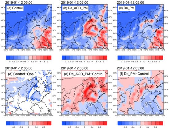 A control experiment (control) and two sets of DA experiments were performed to evaluate the effects of the DA. The control experiment did not assimilate observation data and 60 h forecasts were produced starting at 0500 UTC on 12 January 2019. One DA experiment (Da_PM) assimilated PM2.5 data at 0500 UTC on 12 January 2019, and used the DA analysis field as the initial chemical field. The other DA experiment (Da_AOD_PM) simultaneously assimilated PM2.5 and AOD data. In addition to the chemical ICs, all experiments had the same configuration. The National Centers for Environmental Prediction (NCEP) reanalysis data over a 6 h interval and 0.25-degree by 0.25-degree resolution is used to generate the initial and boundary conditions of meteorological fields.