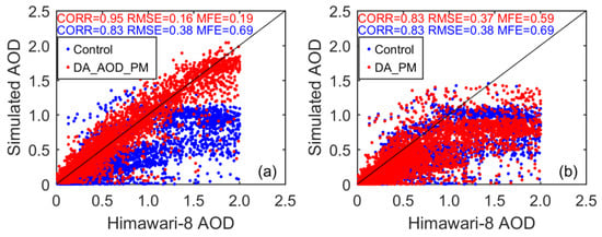 Comparison between the AOD measurements and the AOD in (a) the control IC (blue points) and Da_AOD_PM analysis (red points). (b) Control IC (blue points) and Da_PM analysis (red points).