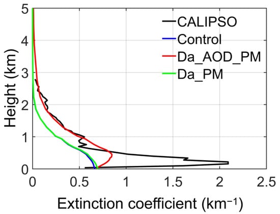 The AEC profile contains information on the distribution of atmospheric aerosols in the vertical dimension. Figure 6 shows the average AEC profile of the CALIPSO measurements, control IC, and DA analysis along the line shown in Figure 1b. Only the grid cells containing all the CALIPSO, PM2.5, and AOD measurements were selected for analyses. As a result, 69 CALIPSO profiles were included in the analyses. The CALIPSO AEC profile (black line) showed an overall trend of first increasing from the ground to a height of about 200 m and then decreasing, and there were unsmooth changes below 1 km, reflecting the complexity of the aerosol vertical distribution in the boundary layer. In contrast, the profile of the control IC (blue line) decreased smoothly from the ground to a height of 1 km, which cannot reflect the fine vertical scale details, as measured. This may be because the model mainly describes the overall condition of the atmosphere; therefore, point and sub-grid information in the boundary layer cannot be characterized successfully. There were small differences between the profile of the Da_PM analysis and the control IC below 500 m, but there was no significant difference above 500 m. This is mainly because the assimilation of PM2.5 introduces observation information near the surface, which can help to improve aerosol analyses near the ground, but the improvement decreased dramatically as the height increased. The Da_AOD_PM (red line) significantly corrected the bias of the control IC and successfully simulated the first increasing and then decreasing trend of the AEC below 1 km. The AEC profile of the Da_AOD_PM was closest to the CALIPSO profile, indicating that assimilating AOD data can substantially improve aerosol analyses in the vertical dimension. However, it should be noted that there is still a large gap between the DA_AOD_PM result and the measurement for an AEC greater than 1 km−1 near the ground, and that the fine vertical scale details in the CALIPSO profiles have not been described. This may be because the adjustment of the vertical structure of aerosols by AOD assimilation is affected by the background field profile as well as the vertical distribution characteristics of the background error covariance. This indicates that AOD assimilation without additional constraints may not perform as well as AEC profile assimilation at improving the vertical structure of aerosols.