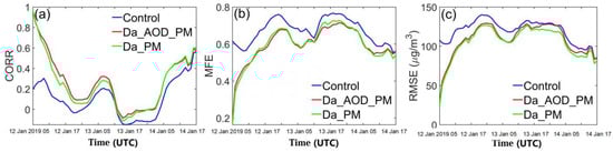 Time series of CORR (a), MFE (b), and RMSE (c) for PM2.5 model forecasts of the control (blue line), Da_AOD_PM (red line), and Da_PM (blue line).