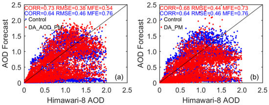 The scatter plots in Figure 5 show a comparison between the Himawari-8-derived AOD measurements and the simulated AOD for the control IC (and DA analysis). The IC for the control experiment (blue points) caused a significant negative bias against AOD observations, especially for AODs larger than 1.0. The Da_AOD_PM (red points in Figure 5a) considerably corrected the negative bias of the control, such that the distance of the AOD in the Da_AOD_PM analysis from the central axis was the smallest among the three experiments. In contrast, the Da_PM (red points in Figure 5b) corrected the negative bias of the control, but the improvement effect, especially for AODs larger than 1.0, was not significant. The distribution characteristic of the scatter points for the Da_PM was similar to that of the control, indicating that the DA_PM had a limited improvement effect on the AOD analyses. The CORR, RMSE, and MFE of the control IC were 0.83, 0.38, and 0.69, respectively, while those of the Da_PM were 0.83, 0.37, and 0.59, and those of the Da_AOD_PM were 0.95, 0.16, and 0.19, respectively. The Da_AOD_PM had the best performance for the improvement of the AOD analyses, especially for the AODs larger than 1.0.