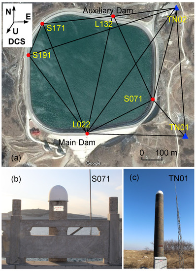 A short-baseline GPS network is set up around the head reservoir with two base stations (TN01 and TN02) and five monitoring stations (L022, L132, S171, S191 and S071). L022 and L132 are located on the main dam and an auxiliary dam, respectively. The layout of the stations is shown in Figure 2. The two base stations are constructed at two stable places with an open viewing environment on the northeast corner (TN02) and southeast corner (TN01) of the reservoir. Each base station has a concrete pillar monument, which consists of reinforced concrete set within a tubular concrete form. A steel sheet was also applied to cover the pillar to maintain the safety of the pillar and to prevent deformation caused by direct solar radiation. The levelling mount and GPS antenna are secured to a stainless-steel pin that is anchored within the top of the pillar. The foundation of the pillar is a cuboid concrete pillar anchored in bedrock. The five monitoring stations are mounted around the reservoir. Each of them has a reinforced cuboid concrete pillar and is 1.3 m high. It should be noted that the main dam monitoring site L022 is connected to the dam body, which is anchored in bedrock. At each station, a TRIMBLE NETRS receiver and a CHOKE RING (TRM29659.00) antenna made by the Trimble in California, America, are installed similarly to the stations used for the International GNSS Service (IGS). Real-time GPS observations at each site are recorded at 5 s intervals and transferred through optical fiber in Radio Technical Commission for Maritime Services (RTCM) format to the server 24 h a day continuously. Before data processing, RTCM format data need to be transferred to the receiver independent exchange format (RINEX).