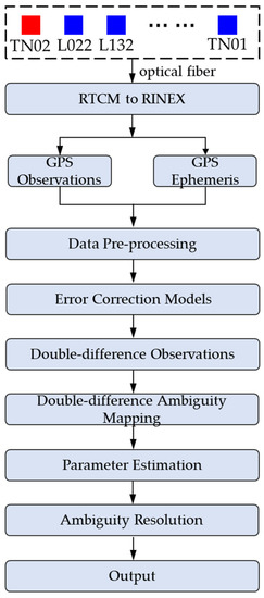 Data processing flowchart. The red square indicates the reference station, and the blues are monitoring stations.