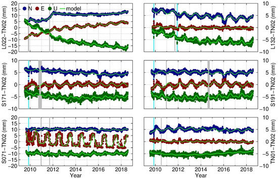 Baseline coordinate time-series and fitting models (North and Up components are moved upward and downward to distinguish the time series. Note the range of the coordinate axes of L022–TN02 and S071–TN02 is larger than that of other baselines). The vertical cyan lines indicate days when there was heavy snowfall and the snow cover changed the antenna phase center, resulting in aberrant solutions in the time series. The gray slices indicate the data gaps.