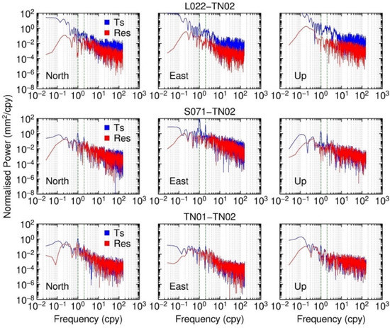 Baseline coordinate time-series power spectra of L022–TN02, S071–TN02 and TN01–TN02, where the x-axis is frequency with the unit of cycles per year, and the y-axis is the normalized power. The blue lines are the baseline time series, and the red lines are the residuals after removing the fitting models. The vertical green dashed lines indicate annual and semiannual frequency.