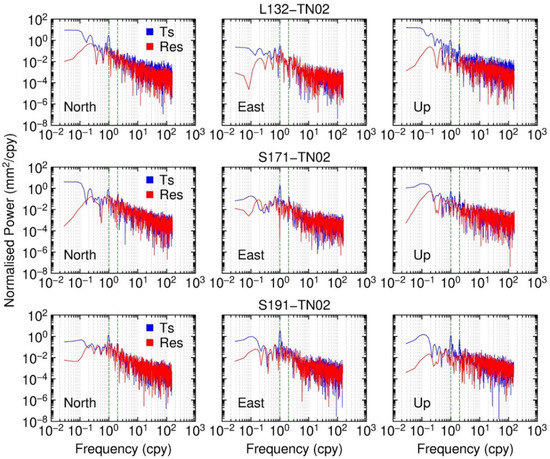 Baseline coordinate time-series power spectra L132–TN02, S171–TN02 and S191–TN02, where the x-axis is frequency with the unit of cycles per year, and the y-axis is the normalized power. The blue lines are the baseline time series, and the red lines are the residuals after removing the fitting models. The vertical green dashed lines indicate annual and semiannual frequency.