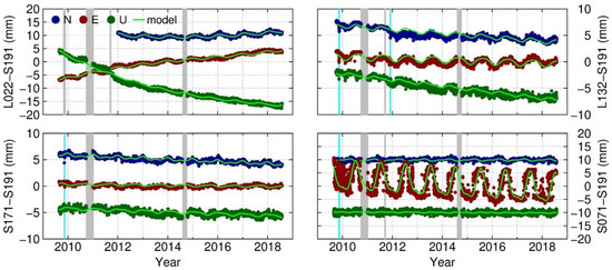 The daily time series (north, east and up) of each baseline generated with the GAMIT software are shown in Figure 4. In the figure, the cyan lines indicate days when there was heavy snowfall and the snow cover changed the antenna phase center, resulting in aberrant solutions in the time series. The gray slices indicate data gaps caused by equipment failures. Outliers that exceed an absolute tolerance of 0.01 m (horizontal) and 0.015 m (vertical) from the median or that have formal errors greater than 0.1 m have been removed from the times series [24].