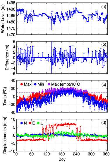 As an example, Figure 8 compares water-level data (a), water data daily difference (b), temperature data (c) and the baseline times series (d) in 2013. Firstly, the water level variance is evident for the day of year (DOY) 1–65, 140–240 and 330–360 in 2013. This is because of power shortages during these periods, meaning the reservoir needed to pump and draw off water frequently to provide electricity, which caused the water level to rise and fall. However, it seems no relationships can be seen by comparing water level (Figure 8a), water level variation (Figure 8b) and baseline time series (Figure 8d). Even though the east component of the baseline time series shows upward offset in the summer, when the water level has large and frequent variance, there are still many cases for which the offset happened in a stationary period of the water’s surface. Thus, the water level may not be the cause of these spurious signals.
