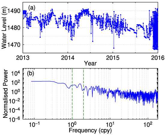 Due to data gaps caused by equipment failure and outliers, the commonly used fast Fourier transform (FFT) cannot be applied in spectral analysis to measure the periodic signal characteristics. Time-series separation or imputation of missing data using interpolation may introduce additional noise or bias or remove long-term periodicities [33,34]. As alternative methods for spectral analysis of unevenly spaced data, least-squares spectral analysis (LSSA) [35,36,37,38] and Lomb–Scargle periodogram [39,40] are often applied to estimate the frequency spectrum of a given time series. In this study, a Lomb–Scargle periodogram was used to show the power spectra of the GPS time series and the temperature and water-level time series.
