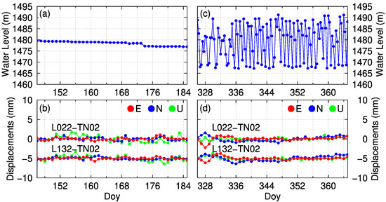 Although the water level is dependent on the power demand of residents, leading to active phases during the summer and winter and quiet periods in spring and autumn, there are no apparent periodic signals from the water level data (Figure 9). However, instantaneous changes of water level may cause corresponding movement of the stations located at dams. Figure 10 shows an example of water level time series in a quiet period (40 days in total from DOY 146 to 185 in 2015) and an active phase (40 days in total from DOY 326 to 365 in 2015), and the corresponding baseline time series of L022–TN02 and L132–TN02 are also shown. No matter whether in a quiet period or active phase, the baseline time series on dams show no relevant movement with respect to water level variations, even when the water level changes 20 m a day. More research may need to be carried out to identify the relationship between water level and baseline time series.