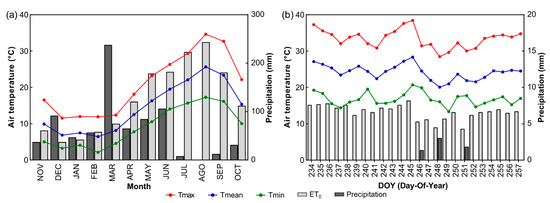 A weather contextualization is provided in Figure 2 (precipitation, evapotranspiration, and mean, minimum, and maximum air temperatures) both monthly (from November 2017 to October 2018) and daily (between the period analysed). Data were obtained from the E-OBS gridded dataset v25.0e [56] by providing the central latitude and longitude coordinates of the vineyard.