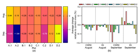 Relative difference of the canopy temperature (°C) (a) and of the estimated indices (b) from the grapevine vegetation in August and September in each plot. Data represents the average change of kaolin-treated plants relative to control vines of Touriga Nacional. CWSI: crop water stress index; IG: stomatal conductance index.