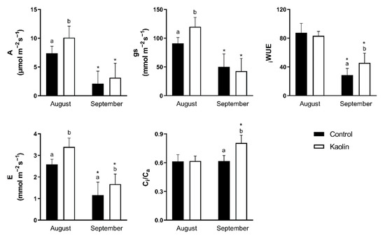 Leaf gas exchange parameters of Touriga Nacional control and kaolin-treated grapevines at midday (14:00 GTM+1). Stomatal conductance (gs, mmol m−2 s−1), net CO2 assimilation rate (A, µmol m−2 s−1), intrinsic water use efficiency (A/gs, µmol mol−1), intercellular CO2 concentration (Ci), ratio of intercellular to atmospheric CO2 concentration (Ci/Ca), and transpiration rate (E, mmol m−2 s−1). Data are mean ± SD of six replicates. Different lower-case letters represent significant differences between treatments (control vs. kaolin-treated) within each month. * p < 0.05 represent significant differences between sampling months (August vs. September) within each treatment.