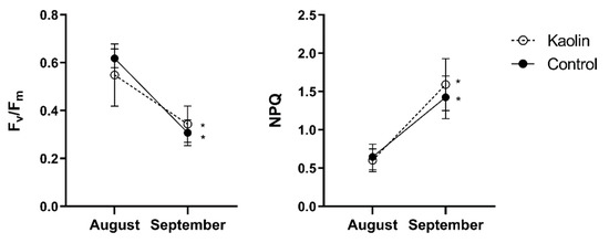 Midday chlorophyll fluorescence variables of Touriga-Nacional grapevines in control and kaolin-treated leaves throughout the experiment. Parameters measured: maximum (Fv/Fm) quantum efficiency of PSII and non-photochemical quenching (NPQ). Data are mean ± SD of six replicates. Different lower-case letters represent significant differences (p < 0.05) between treatments within each month. * denote significant differences (p < 0.05) between months (August vs. September) within the treatment.