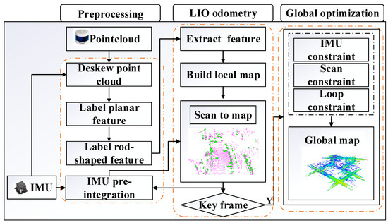 First, the preprocessing module, the raw point clouds are de-skewed using gyroscope data and IMU pre-integration value. Current scan’s point cloud is projected to the 2D image. The depth characteristic value is used to remove the outlier points. Image is used to segment the planar feature and cluster the rod-shaped feature information.