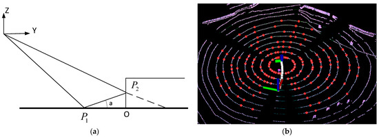 Illustration of the planar feature information (a) The angle between the lines for judging the surface; (b) Red points are the planar feature in the scan.