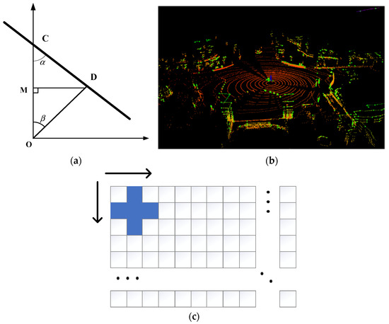 Similar to LOAM, the depth information of each point is used to eliminate parallel points and occluded points, which have certain influence on the subsequent solution. In the feature extraction process, each frame is divided into 6 sub-images, which has a resolution of 16 × 300. Edge points and planar points are extracted from each sub-image, which are determined according to threshold and . In this work, and are chosen to be 1 and 0.1. The edge point set and planar point set extracted from k frame are and .
