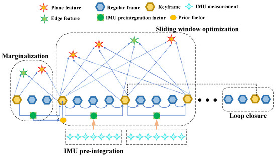 In this formula, means the prior residual according to the measurements which are marginalized out because of the sliding window. , and denote the LIDAR, IMU and loop closure error terms. Figure 6 shows the optimization process.