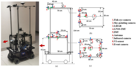 M2DGR [31] datasets were recorded using ground robots. As shown in Figure 7, A HDL 32E Velodyne LiDAR (labeled 3 in the figure) was used to scan the surrounding environment and obtain the 3D point cloud. The IMU device is Handsfree A9 (labeled 5 in the figure), which is a 9-axis sensor. In outdoors, the satellite visibility is good so that the GNSS-RTK suite (labeled 4 in the figure) outputs high-precision ground truth. For indoor environments, the ground truth trajectories are recorded with a motion-capture system which consists of twelve highspeed tracking cameras. The spatial relationship among different sensors have been calibrated.