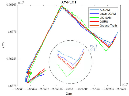Street_01 is chosen for our analysis. Figure 8 shows the trajectories of the four algorithms in street_01 in X-Y plot. The accumulative error of four algorithms can be obtained from the detail diagram. Our system makes reasonable use of feature information, which effectively improve the accuracy of point cloud matching. Planar points are extracted from ground surface feature information, and edge points are extracted from rod feature information. We notice that ALOAM, LeGo-LOAM and LIO-SAM will drift and have a large deviation when it comes to turning. However, in this system, the point cloud registration has been greatly improved.