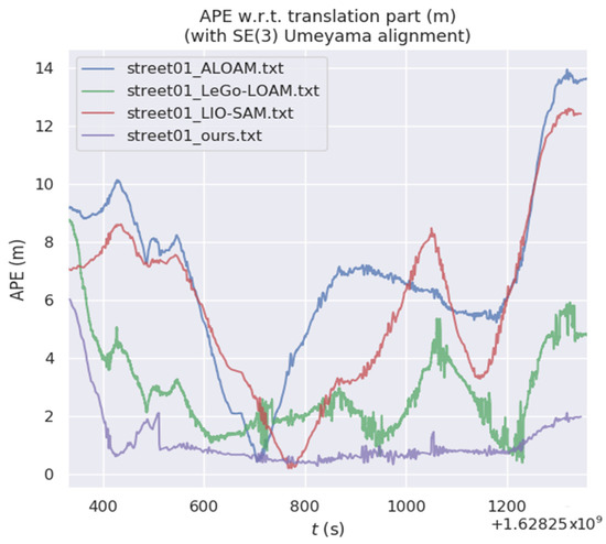 More detailed evaluations have been conducted. Figure 9 shows absolute trajectory error variation for 4 algorithms in street_01. ALOAM have largest error without IMU measurements, and its scan-to-scan method has a bad influence, which is easy for providing inaccurate information in the scan-to-map module. LeGo-LOAM applies a two-step scan-to-scan method, which is beneficial for improving efficiency, but it still introduces much error. Moreover, without IMU constraint, loose-coupled LIO system such as LeGo-LOAM cannot adequately make use of sensor observation information. In LIO-SAM, there is no point cloud preprocessing section. Lots of unstable observations also have bad effects on point cloud registration.