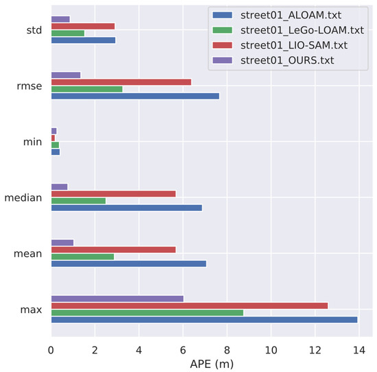 In Table 2, the bold and italic values indicate the minimum error. Seven groups of experiments prove that our algorithm improves the accuracy in most scenarios. Especially in a scene such as a street. In the sequence “Circle_02”, our LIO system has a higher error than LeGo-LOAM. That is because “Circle_02” is collected in a fixed scene and the ground robot is always rotating. This motion state has slightly bad effect on IMU pre-integration. Other than “Circle_02”, our system benefits from the tightly couple of inertial and LIDAR information. In the sequence “Gate_02” and “Hall_05”, the four algorithms perform equally well. These two scenes are simple and rich in structural features. However, in the street sequence, our algorithm can greatly improve the performance.