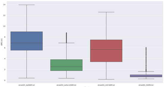 Figure 14 shows the processing time of each frame. We can clearly see the lowest cost time of our system. In ALOAM, the mapping module uses the global map and map maintenance is time-consuming. LeGo-LOAM and LIO-SAM are the same, which apply Levenberg–Marquardt algorithm [32] of 30 iterations for optimization. Our algorithm uses faster and more accurate graph optimization model to solve the scan-to-map module (see Section 4.2 and Section 4.3).