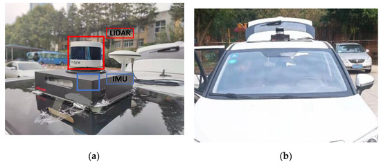 Our sensor suite. All have hardware time synchronization (a) IMU is in the LIDAR below. Integrated navigation device is used to gain ground truth. (b) The device is mounted on top of the vehicle.